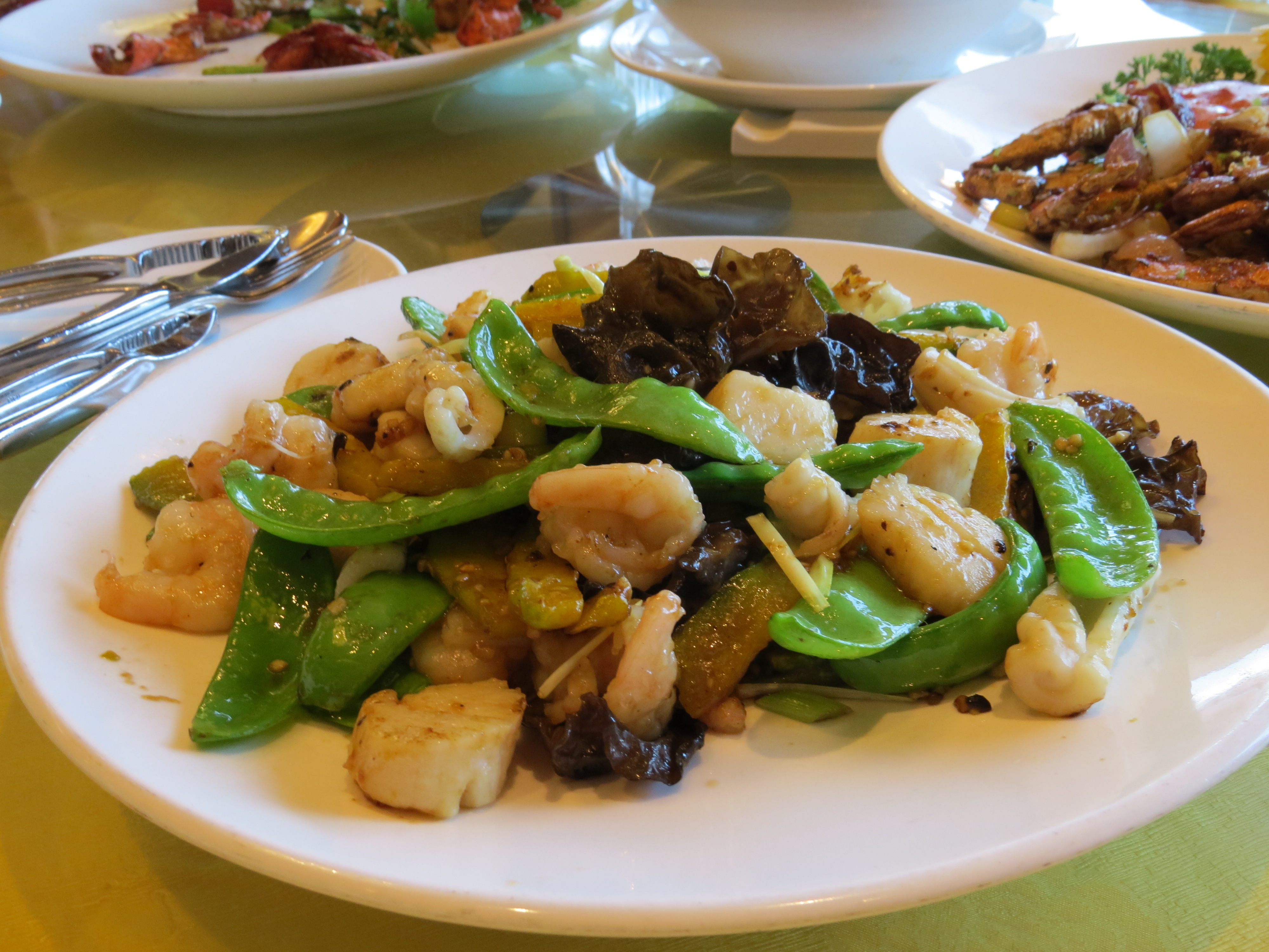 The Sauteed Three Kinds of Seafoods with Black Fungus and Greens had shrimp, scallops, and cuttlefish. The snap peas were cooked so they remained crunchy and this was a flavourful dish overall.