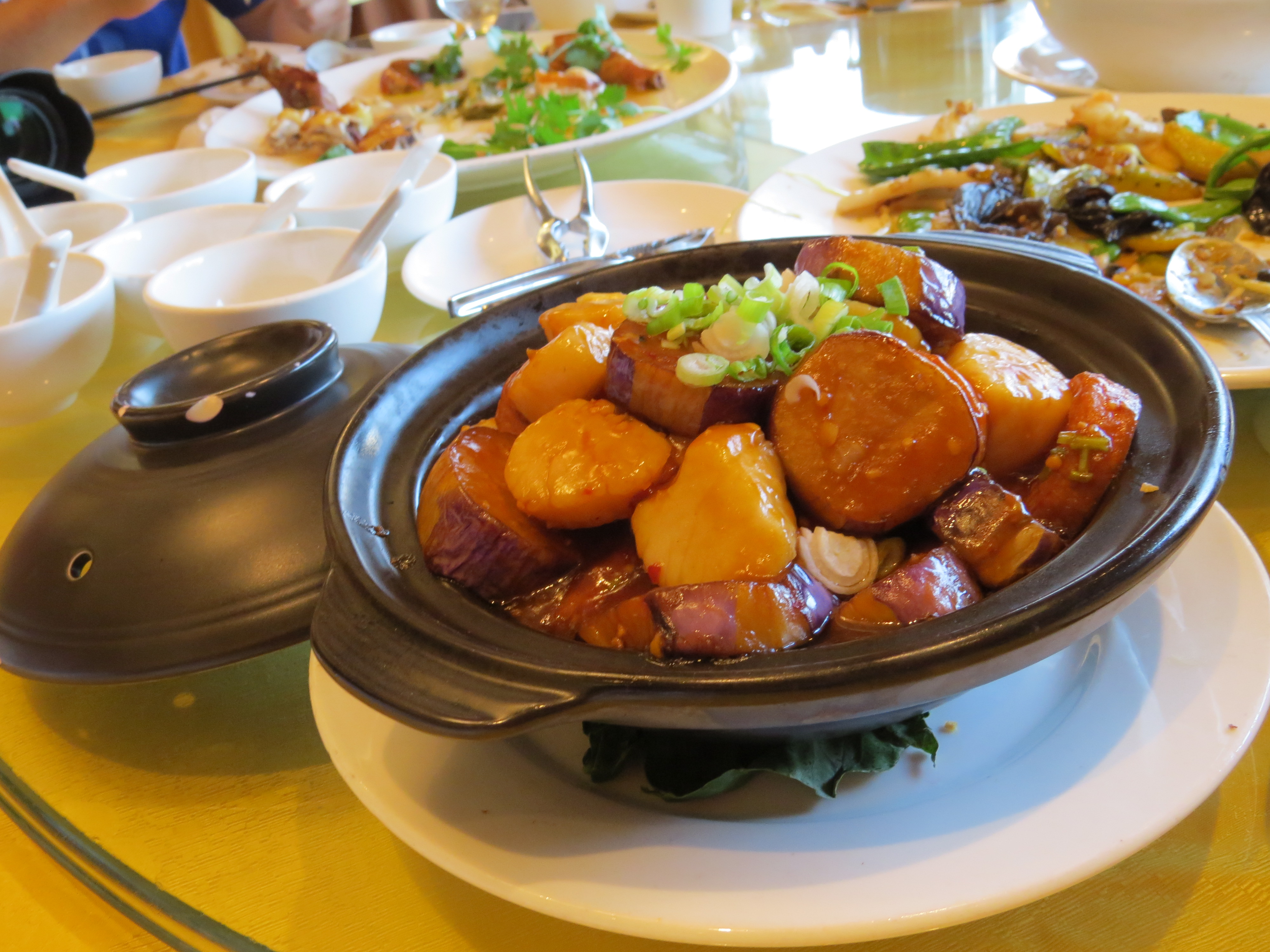 Scallops & Egg Tofu with Eggplants in Spicy Garlic Hot Pot 漁香三子煲