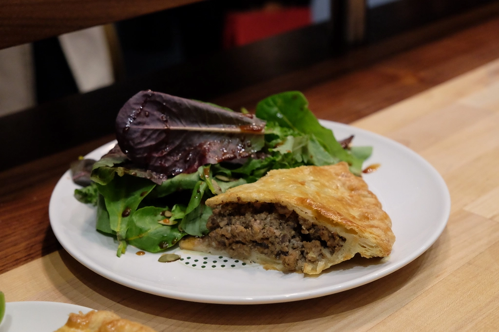 As for the savoury option, you get a Tourtiere which is filled with 100% alll-natural, non-gmo, no antibiotics, grain fed beef and pork from local suppliers. There is also organic onion, mushrooms, celery, garlic, stock, breadcrumbs, cinnamon, cloves, pepper and salt. This was served a bit cold for us since I’m guessing they weren’t completely sure what time we would arrive. However, I can imagine this to be delicious served warm as the filling itself is moist and flavourful.